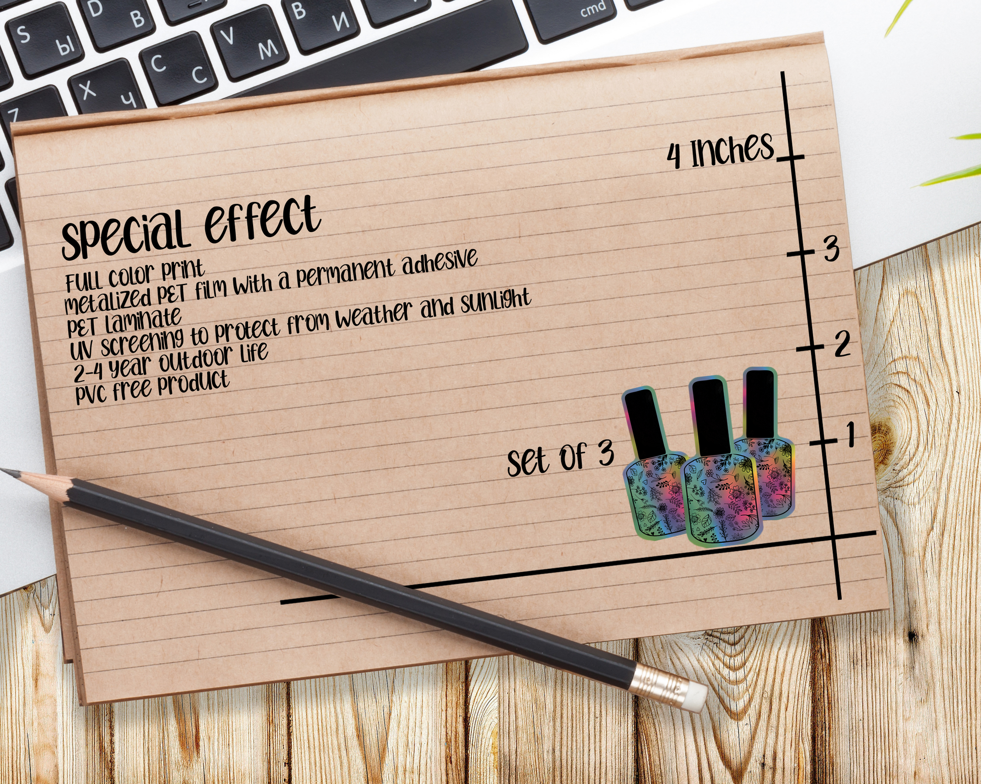 These stickers are premium, high quality - professionally printed die cut adhesive stickers/decals. They have a permanent adhesive and will be weather resistant from 3-5 years. These are not a "holo effect" they are printed professionally on vinyl with a gloss finish and an iridescent shine  - a light-refracting material.